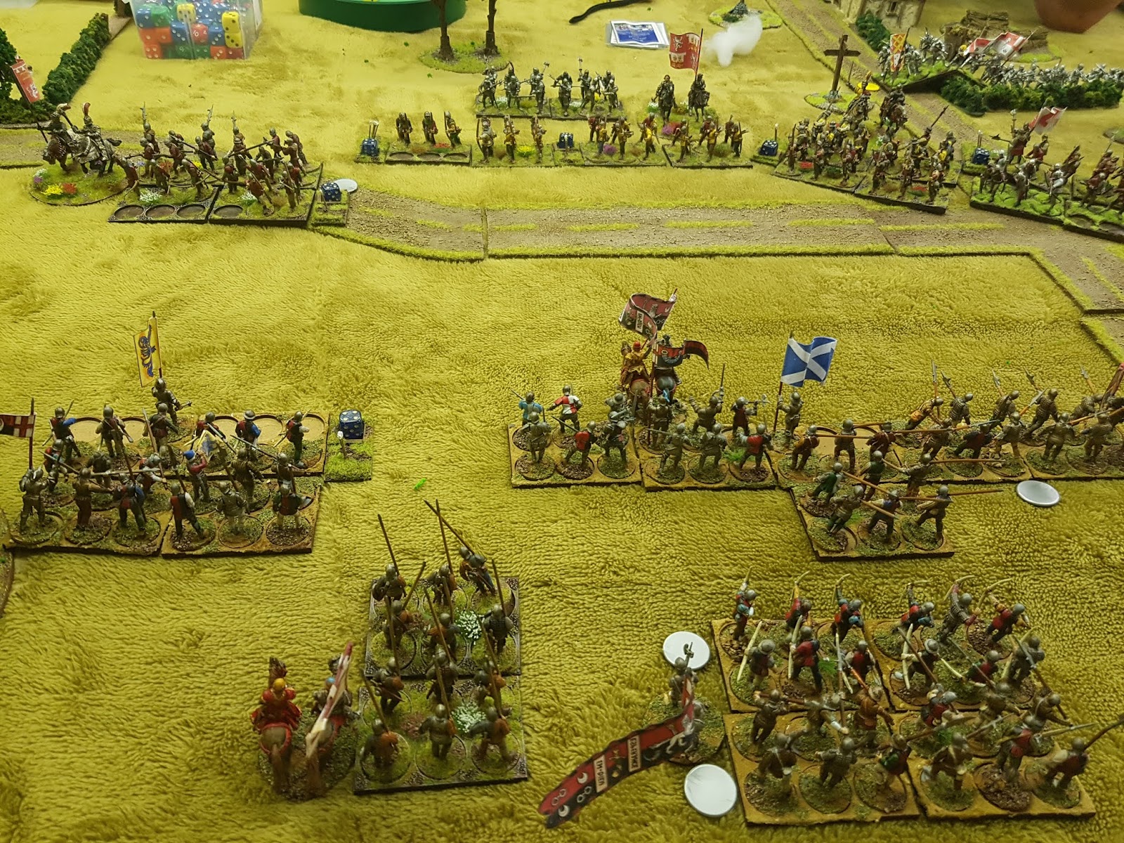 The rules played very well. We only had a couple of queries afterwards which were answered very quickly on the really active Facebook page by Andy Callan. The rules themselves have a rather 'old school' feel but without too many modifiers etc to keep track of. There is a definite hint of Donald Featherstone rules with a touch of Sharp Practice. Some tokens are needed to record use of arrows (archers have a limited amount), which units are Disarrayed or Daunted and it's also important to be able to track which units have activated or not as, at the end of each round there are a couple of options for units which haven't been ordered earlier in the turn. This does mean there is a certain amount of tokens etc on the table which I know not everyone likes, but this didn't detract at all from the game. Leaders are activated by cards and then have a number of orders including activating units under their command, rallying or moving. There are also bonus cards and special events which can crop up throughout the game.